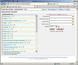 Registration Studio was developed by and is solely owned by Twin Vision Studios, Inc. It allows clients to create customized online registration web sites.  The system uses a complex administrative system to allow users to customize their events with sessions, locations, lodging, real-time credit card ecommerce and member management.